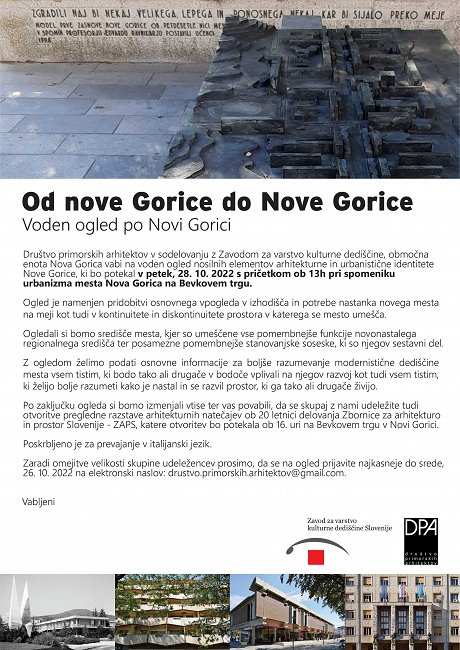 Društvo primorskih arhitektov v sodelovanju z Zavodom za varstvo kulturne dediščine, območna enota Nova Gorica vabi na voden ogled nosilnih elementov arhitekturne in urbanistične identitete Nove Gorice,
