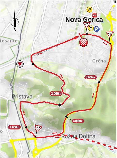 Cesta v Rožni Dolini R2 444/0365, cesta G2 103/0438 pri Petrolu v krožišču zavoj desno na Pot na Pristavo LC 284 172, po Kostanjeviški cesti desno LC 284 172, mimo Laščakove vile navzgor proti Novi Gorici, po Streliški poti, Ulici Šantlovih do križišča z Erjavčevo ulico LG 287 032, zavoj desno mimo stadiona (križišče), hotela Park (križišče), nebotičnika (krožišče) LG 287 031 do naslednjega krožišča z Vojkovo cesto pri Qlandiji, kjer sledi zavoj desno na G2 103/1486 skozi tunel, nazaj desno na Vipavsko cesto G2 103/0438. Cilj je pred Eda centrom na Erjavčevi ulici. Krog se 4x ponovi.