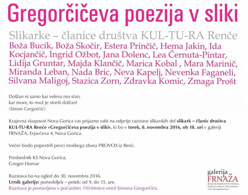 Vabljeni na odprtje in ogled razstave slik, slikark članic društva KUL-TU-RA Renče, ki so jo pripravile v počastitev 110-letnice smrti Goriškega slavčka Simona Gregorčiča.
